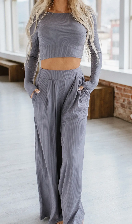 The comfortable two piece set is perfect for lounging or lunch out with friends. This outfit features a cropped top and wide leg pants that flatter every body type but also move with your body. This set will make you feel amazing!
